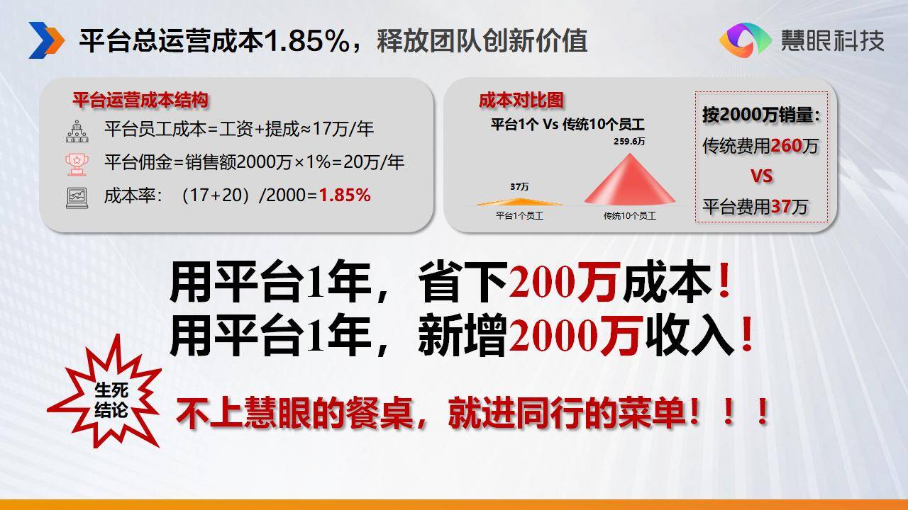 按2000万发卖额计较厂家每年可节流200万+运营成本。建材中小企业受成本挤压和市场需求疲软影响,它就像建材财产的由器,慧眼集采恰是这一趋向,5%-8%的平台佣金已跨越很多厂家的毛利空间。把握当下才能抢占先机。